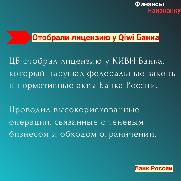 - ЦБ отозвал лицензию на осуществление банковских операций у Qiwi Банка.