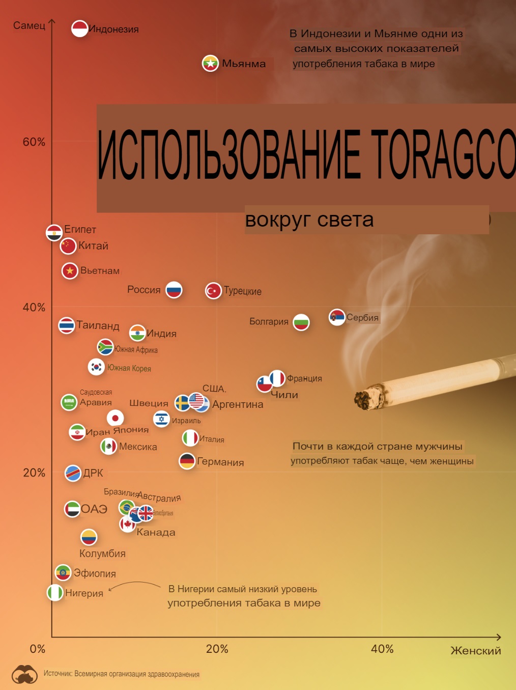 С региональной точки зрения мы видим, что во многих странах Европы и Азии показатели употребления табака выше. В Индонезии и Мьянме , в частности, одни из самых высоких показателей потребления табака в мире: по оценкам, 73,6% индонезийских мужчин курят или употребляют табак.