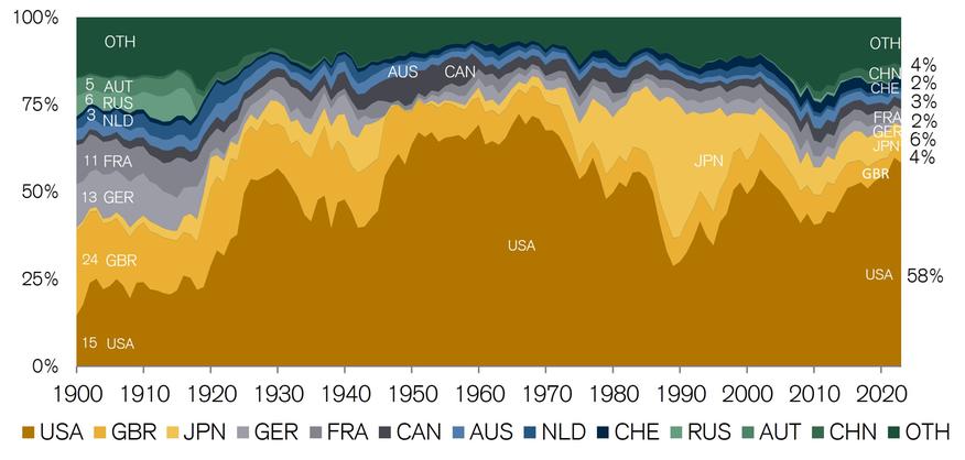 США занимают 58,4% мировых фондовых рынков по состоянию на конец 2022 года.