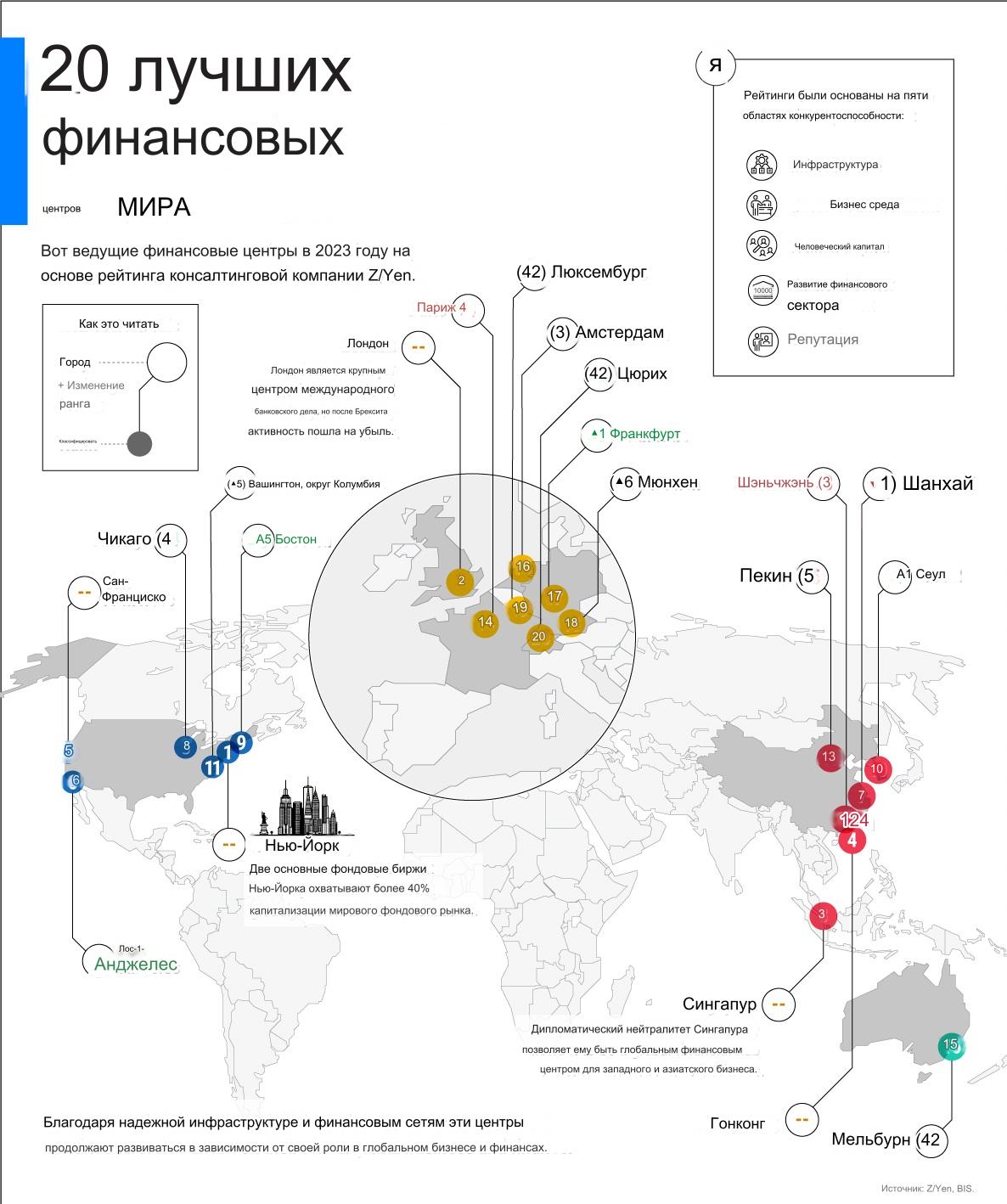 На этом рисунке показаны ведущие мировые финансовые центры в 2023 году, основанные на рейтингах консалтинговой группы Z / Yen.